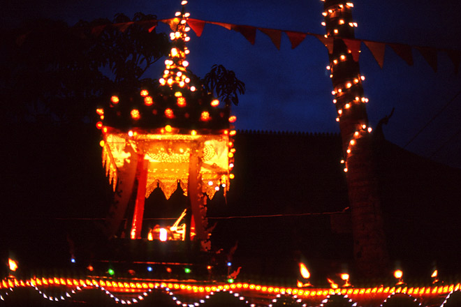 ほろ酔い加減の帰り道。ワット・ビスンナラートという寺院で、船に施された幻想的なライトアップと出会う。