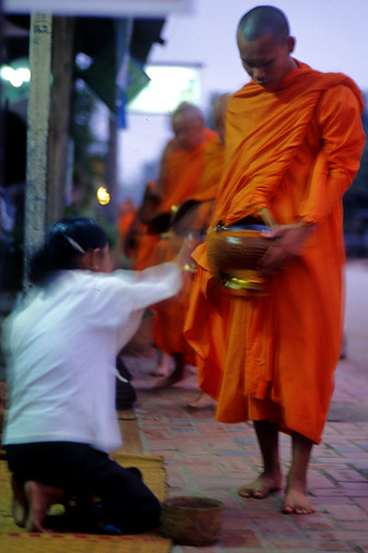 文字通り目の覚めるような朱の衣をまとい、布施を受け取った僧が次々と目の前を通り過ぎ、去っていく。かと思えば、遠くからまた別の托鉢の列が音もなくこちらに近づいてくる。その繰り返しを、片隅で眺めていた。