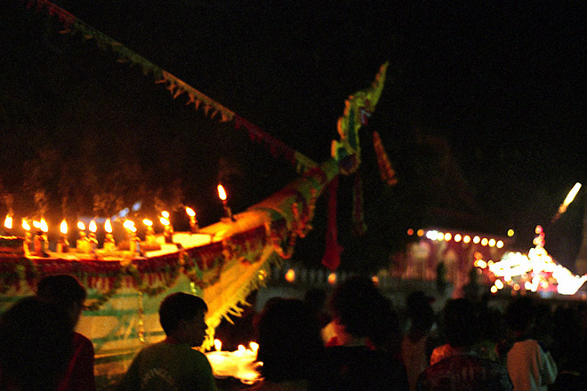 プーシーの丘を迂回するように大きく弧を描く真っ暗な夜道を、ぞろぞろ歩いていく。カーン川を渡り、町でいちばん大きいシーサワンウォン通りまであとわずかという坂道の途中で、みないっせいに声にならない驚きの声を上げた。この時間にはすでにひっそりと静まりかえっているはずのシーサワンウォン通りから、きらびやかな光と華やかな歓声があふれるように漏れてきたからである。急いで坂道を登り切る。通りには、人の列が途切れることなくどこまでも続いている。その人の波間を、ほのかな炎に照らされた巨大な船や竜が見え隠れしながら漂っている。沿道にも数え切れない人、人。お祭りとは聞いていたけれど、まさかこんなにも盛大なものだとは。