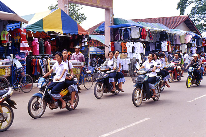 店の前を走る舗装道の向こうはメコン川の土手らしいのだが、道に沿って出店がびっしりと並んでいるので、肝心の川はまだ見えない。目の前では、人々やバイクがひっきりなしに行き交う。それにしても、やけに賑わっている。もっと静かでひっそりとした町だとイメージしていたのだが。