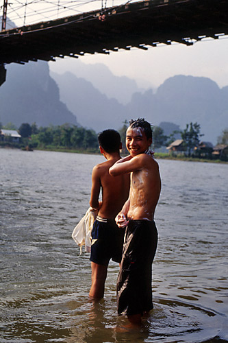 レストランやゲストハウスが立ち並ぶ通りは思いのほか観光色が強かった。通りはやがて大きく弧を描くように左に曲がると、南へとまっすぐ続いていた。そのまま歩いていくことにした。次第にのどかな風景へと変わっていく。さらにしばらく進むと、右へ折れる一本の小道を見つけた。その道をたどってみると、ソン川にぶつかった。立派な吊り橋がかかっていた。その向こうには奇妙な形をした山が並んでいる。岸に近づくと、男たちが洗濯と水浴びをしていた。