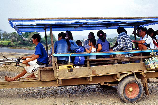 荷台に大勢の人を乗せている。乗り合いトラクターとでも呼べばいいのか。