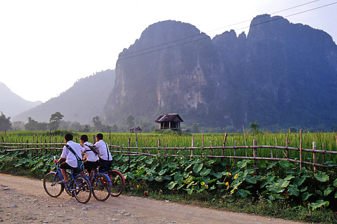雑木林を抜けると、視界が一気に開け、いっそうまばゆい光と鮮やかな色に包まれた。左右には緑の田んぼがさあーっと広がっている。正面には、やや西に傾いた太陽が衰える気配も見せず、強烈な熱と光を放っている。バンビエンの村からも望むことができる奇怪な山々との距離もいつの間にかぐっと縮まり、予想外の迫力でそびえている。