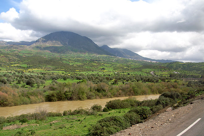 ティトゥアンを発って数キロも走ると、再び丘陵地帯に入った。アップダウンがますます激しくなったが、オンボロバスはエンジンをガーガー言わせながらもそれなりに快調に走っている。左手にはリフ山脈がどこまでも続いている。あの山腹に白い塊が見えたら、そこが今日の目的地である。