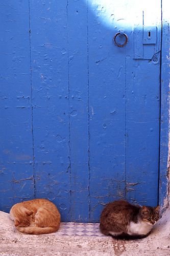 路地を歩いても、青一色に塗られた木のドアが目に留まる。この、白壁に青い扉という組み合わせは、いったいいつ、どこのだれが決めたのだろう。しかも、扉の前にネコがいい感じにウトウトしているのだからたまらない。哀愁までしっかりと漂わせていやがるのが、本当に憎たらしい。