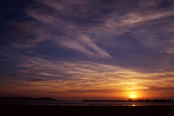 目の前にはビーチと大西洋。右手にはエッサウィラのメディナと港。その遙か向こうに、心なしか哀愁を湛えた夕陽が、静かに、確実に高度を落としていく。これがモロッコで眺める最後の夕陽となるのか。それとも……。