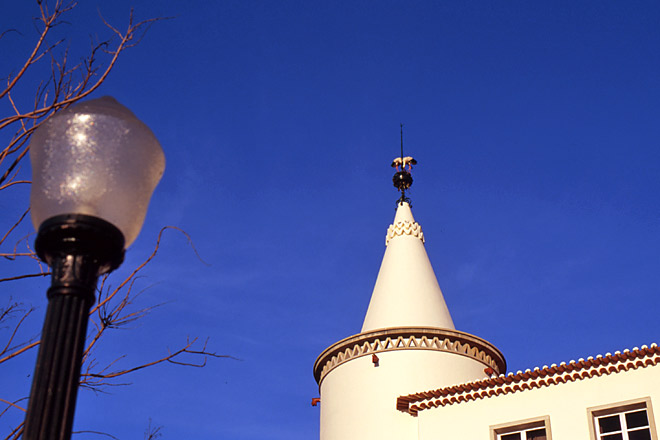 そうした憂愁をますますつのらせるのが、白い壁と青い空。そして、その間を舞うコウノトリ。