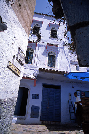 フェスを離れると、いつのまにか車窓には緑豊かな小丘がうねるように広がっていた。やがてリフ山脈にぶつかると、一転して荒々しい山並みが展開され始める。移り変わりの激しい景観を眺めるともなしに眺めているうちに4時間が過ぎた。ひときわ長く厳し峠を越えきると、突然、視界が遙か遠くまで開け、同時に長い下り坂に入った。ようやく山道が終わったのか。しかし前方を見やれば、山肌が露出した荒々しいリフ山脈が依然として彼方まで続いている。案の定、坂を下りきったバスは、そのリフ山脈に向かってエンジンを唸らせながら挑みかかるように突入していく。と、山の中腹あたりに、白い家の群れが。
