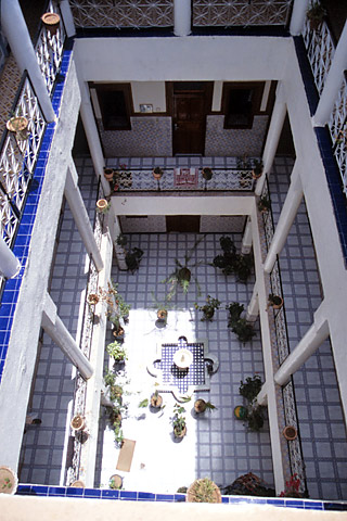 赤茶色の素っ気ない外観とは対照的に、内部はとても美しく、手入れも行き届いている。パティオと回廊には鮮やかなタイルが敷き詰められ、花が飾られている。モロッコの住宅の特徴をかいま見た気がした。 |