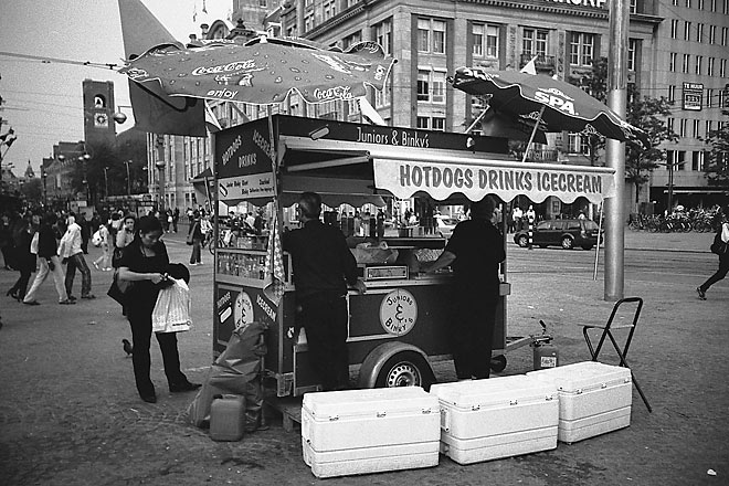 無事入国すると、広い構内を横切り、きっぶを買って列車に乗り込む。大都市近郊だというのに、車窓を横切る風景はきわめてのどかだ。およそ20分で、アムステルダム中央駅に到着。駅前から真っ直ぐに延びる道をブラブラ歩くと、王宮前のダム広場に出た。