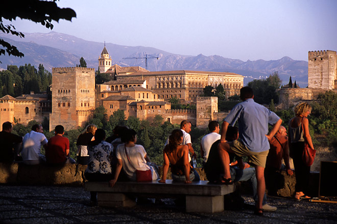 短いが急な階段を上って広場に入った。アルハンブラ宮殿が、対面の切り立った丘の上に堂々たる姿を見せていた。はるか後方には、シエラ・ネバダの山並みが見渡せた。