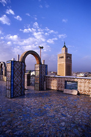 ここの屋上は美しかった。床一面に青いタイルが敷き詰められている。その背後には、夕日を一身に浴びるミナレット。画になるではないか。何枚か写真を撮ると、しばらくの間この旧市街のパノラマを楽しんだ。最後にメディナに来た甲斐があった。これで思い残すことはない。あとはフェリーに乗ってシチリアに渡るだけだ。 |