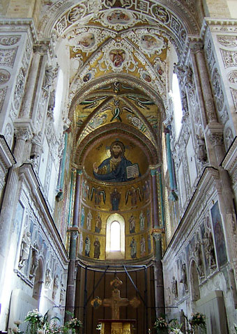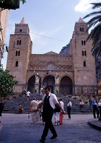 | チェファルーの大聖堂は、モンレアーレの大聖堂と並んで、シチリア・ノルマン様式の典型と言われている。質実剛健な姿のなかにも、マグレブ独特の角型ミナレットを連想させる二本の鐘楼や、ファザードに施されているアーチなど、イスラム的な要素が散りばめられている。外見はモンレアーレの大聖堂とそっくりだが、チェファルー大聖堂を特徴づけているのは、その背景だ。モンレアーレの大聖堂には平和的な雰囲気が漂っているのに対し、こちらにはすぐうしろに荒々しい崖がそそり立っているので、全体的に緊迫感のような雰囲気が漂っていて、圧倒されるような感覚を覚える。 |
