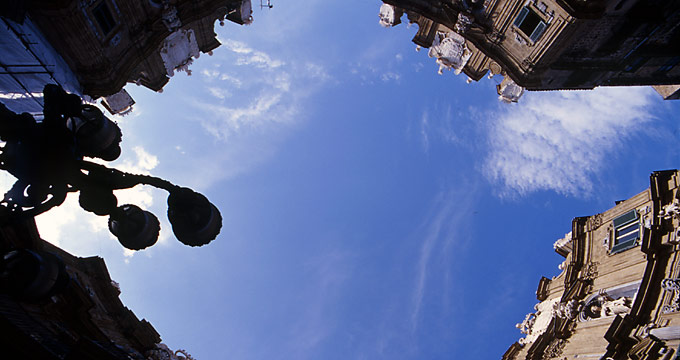 ゲーテがこう記している、二本の街路が交叉するスポットがこのクアットロカンティだ。パレルモのへそに当たる部分であり、観光者にとってのランドマークでもある。見所としても面白い。まず形状がユニークだ。四つ角のそれぞれが切り落とされ、ちょうど八角形をなしている。空を見上げてみればよくわかる。切り落とされてできた各面はファザードになっていて、バロック様式の彫刻が施されている。十字路というより、劇場の舞台を眺めているような錯覚にとらわれる。