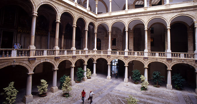 近くのバールで一休みしたあと、ヴィットリオ・エマヌエーレ通りを今度は西へ、つまり山側へと進む。さっき見学したカテドラーレを右手にやり過ごし、なおも数分歩くと、左手に大きな建物が見えてきた。ノルマン王宮らしい。もともとはアラブの城塞であったものを、ノルマン王朝が宮殿として改築したもの。