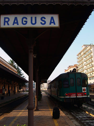7時過ぎにホテルをチェックアウト。15分ほどでラグーザ駅へ。目立たない、小さな駅だ。切符売場が閉まっている。一体どこで切符を買えばいいのか。プラットフォームに立っていた駅員にたずね、裏のオフィスでやっとチケットを購入。対面に停車している列車に乗り込む。が、ここで何度目かの失敗。乗車前に切符に刻印を押すのを忘れてしまったのだ。発車後、検札に来た車掌にイタリア語でブツブツ文句を言われてしまう。だってしょうがないじゃーん。こんなシステム、日本にはないんだからさ。と少々逆ギレ気味。