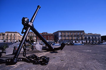 大通りをしばらく歩くと、橋が見えてきた。目の前の巨大な錨が、ここが古代からの由緒ある港であることを物語っていた。橋を渡り、オルティージャ島へ。