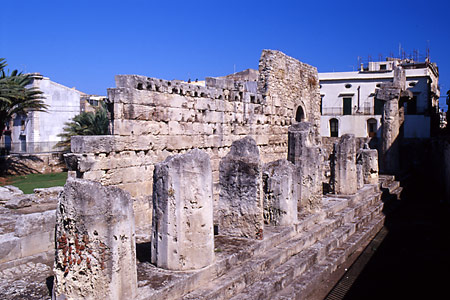 さらに本土側に歩くと、アポロン神殿。シチリアで最古のドーリス式神殿とされているが、往時の姿はほとんどとどめていない。ここも教会に転用されたのだけど、時代を下るにつれ、さらにモスクや兵舎としても使われたというから、そのぶん破損もひどくなったのだろう。