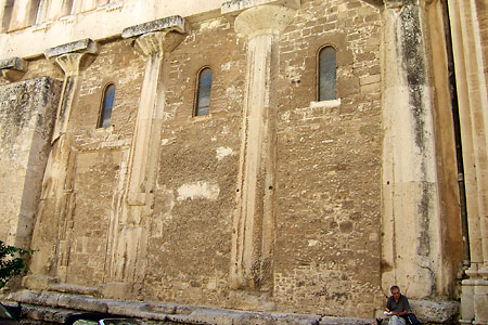 このドゥオモの最大の特徴は、紀元前5世紀に建立されたアテナ神殿をそのまま教会として転用したという点にある。ファザードを見ただけではそのことには気づかないが、側面に回ってみると、神殿の円柱がそのまま壁の一部として使われていることがわかる。内部にも円柱がそのまま残っている。これは、かなり興味深い。