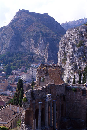 そのタウロ山の裏側に、さらに一段高い山があり、その頂にも建物が見える。カステルモーラの村だろうか。タウロ山はともかく、あの村はぜひとも訪れたいと楽しみにしていた。こぢんまりとした村のたたずまいは趣がありそうだし、あの頂上から眺める夕陽はさぞかしきれいだろうと想像できるからだ。ここからバスが出ているはずだから、脚を酷使せずとも容易にたどり着けるはずだ。タオルミーナの町を一通り見たあとで訪ねてみることにした。 |