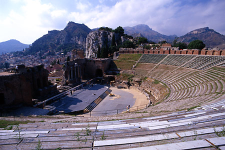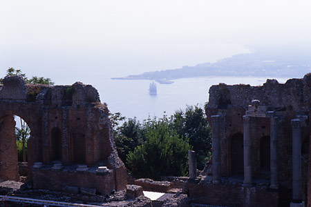 ついに最上段に立った。目の前に開けている眺望は、たしかに壮観ではある。でも、なにか物足りない。大気が霞んでいるせいだ。全体的にぼんやりしていて、見通しが良好とは決して言えない。落胆を隠せなかった。本来なら、舞台の背後には、長大なすそ野を誇るエトナ山がその優雅な姿を見せているはず。そのエトナ山と地中海と劇場が一体となった光景が、あたかも一枚の画のように美しいとされているのに……。訪れたタイミングが悪かったのだとあきらめるしかない。