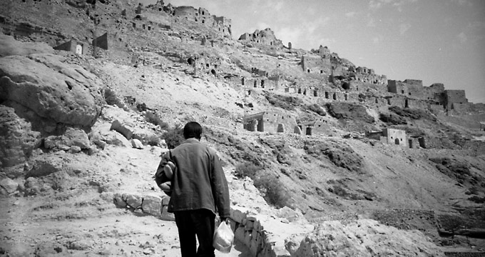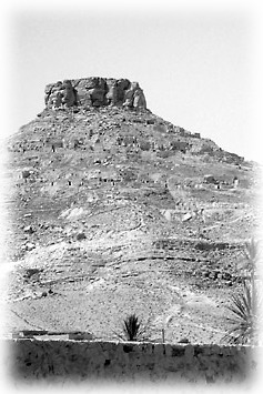 次の目的地はシェニニ。丘の上に形成された典型的なベルベルの集落ということだった。ボロ車は今のところ快調のようだ。道の左右には、石と砂だけの単調な世界が広がっていた。それだけに、遠くにそびえる荒々しい小山の連なりが凄みを帯びて見え、ごく自然に目が引きつけられた。その頂のひとつには、アリの巣のような穴がいくつもあいていた。よく見ると、それは集落だった。まるでカメレオンのようにその家々は山肌と一体化していた。車を停めてもらい、その異様な姿を眺めた。ゲルマッサという集落だという。あんな険しい山の頂に住んでいて、いったい水はどうやって確保するのだろう。モロッコの砂漠地域でもベルベル人の苦しい生活の一端を目の当たりにしたが、この地の環境も相当に過酷だ。今では住民はふもとで生活しているとのことだが、かつては確かにあそこに住んでいたのだろう。追いやられた少数民族がその文化を固持・継承してくのは並大抵のことではない。