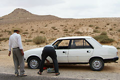 最後に、クサール・ウレド・スルタンに向かった。しかし、途中でハプニング。オンボロ車の前輪がパンクしたのだ。出発前に抱いた不安が的中してしまった。しかも、ジャッキがないので通りがかりの車を呼び止めて借りるというベタな展開。とはいえ、目的地はあとひとつだけ。急ぐ必要もないので