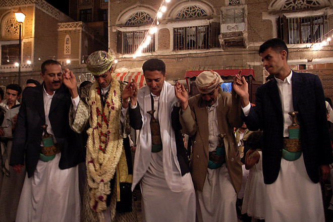 楽士たちに目をやると、中央にウード奏者を見つけた。ウードは日本の琵琶や西洋のリュート、ギターの原型となり、『千夜一夜物語』にも登場する由緒ある楽器。イエメンの結婚式でも生演奏にお目にかかる機会は減ってきているらしいから、間近で演奏を見ることができるのはラッキーなのかもしれない。