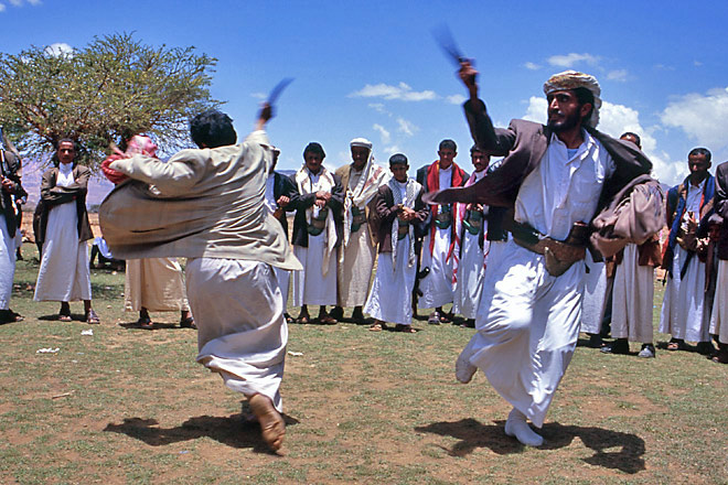壮齢の男二人が見せる勇者の舞い、である。二人の顔の表情ひとつ、ジャンビーアの軌跡ひとつに、これまでにない真剣さと勇壮さが宿っている。緊迫した間合い。だが二人の動きは絶妙に連動し、齟齬をきたすことがない。息のあったコンビネーション。きっとこれまでの人生の中で、何度も何度も舞ってきたのだろう。